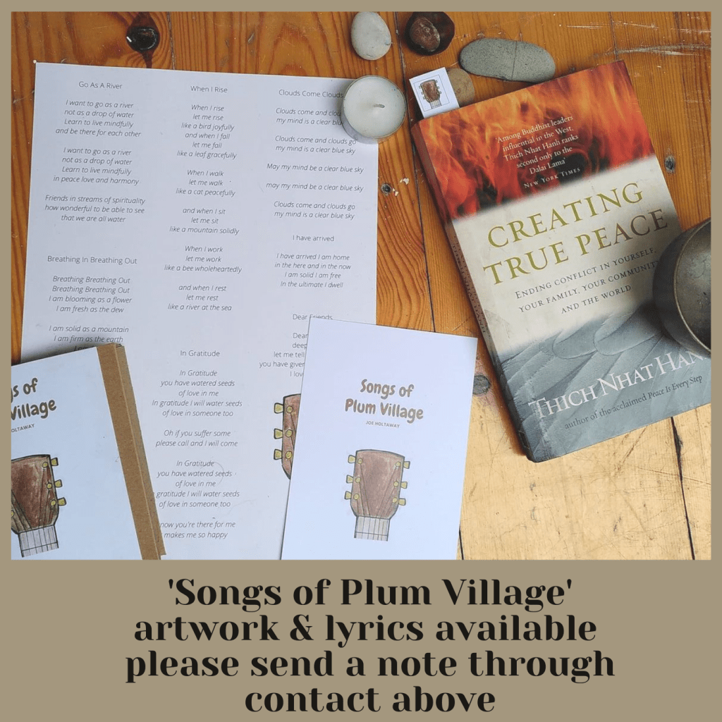 In his foreword to ‘Basket Full of Plums’ Thich Nhat Hanh says this about Plum Village’s relationship to songs, ‘They are a kind of spiritual music that facilitates understanding and happiness in people, I invite you to become my co-students learning how to play music in such a way that it will bring peace to our society our community and ourselves’.