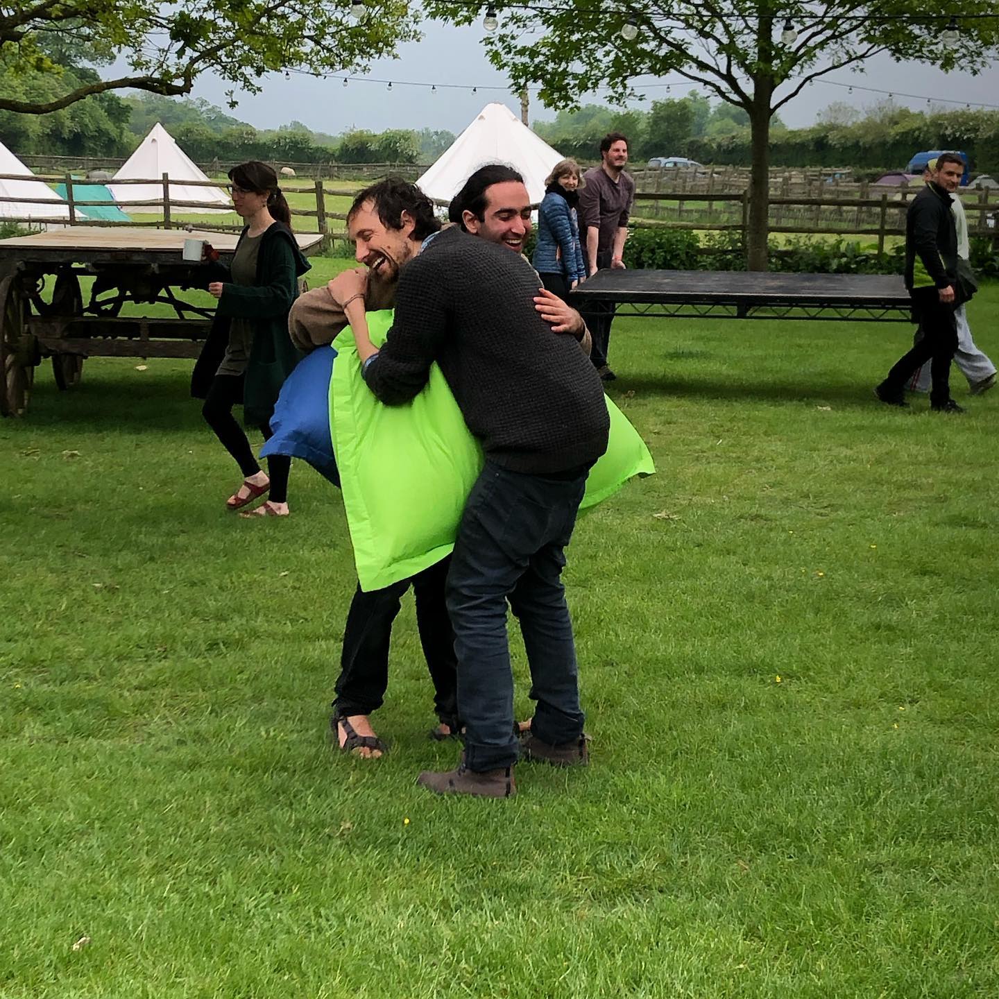 A beloved picture of Kareem and I together at a retreat some years ago hugging a big green cushion!