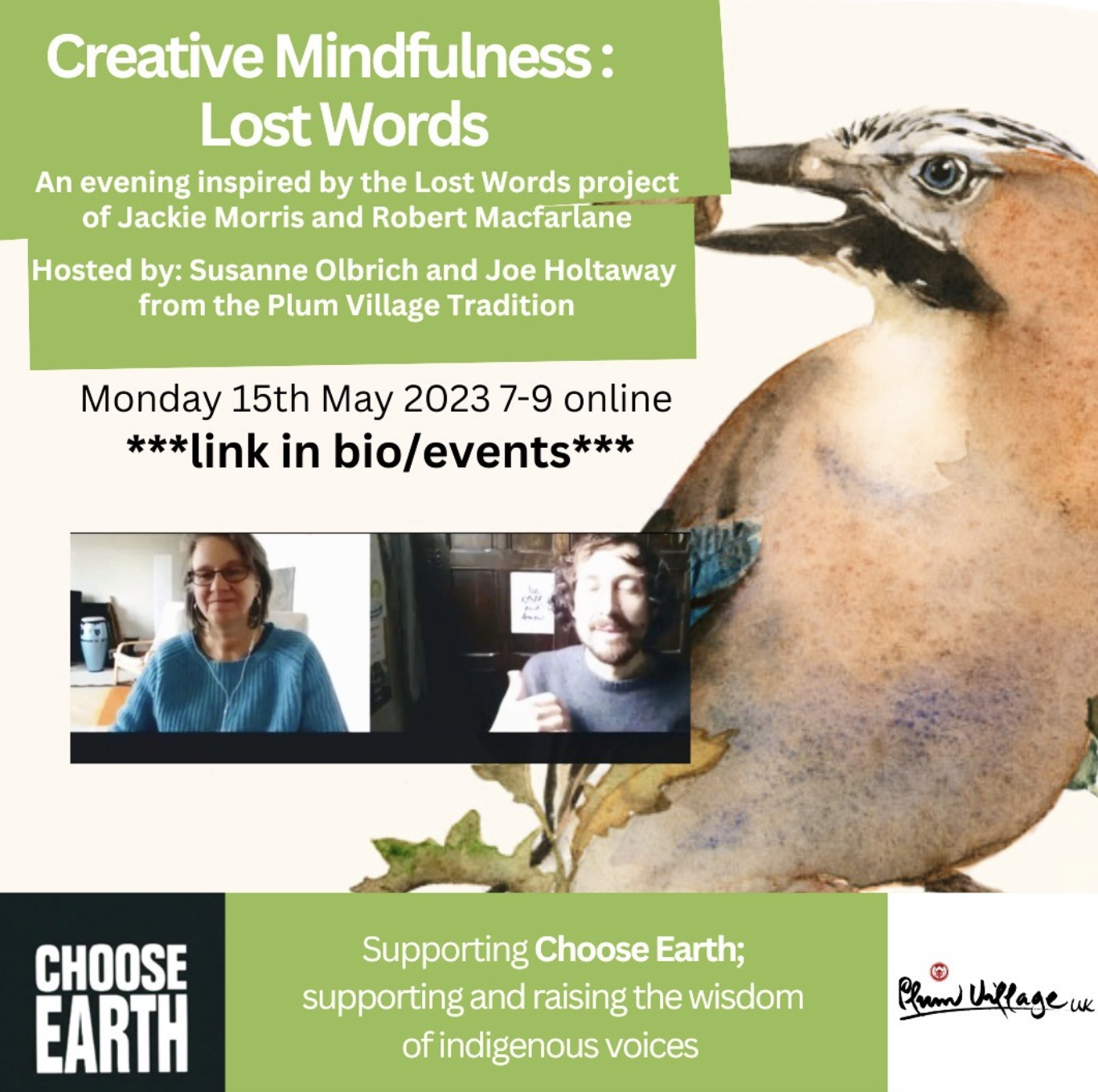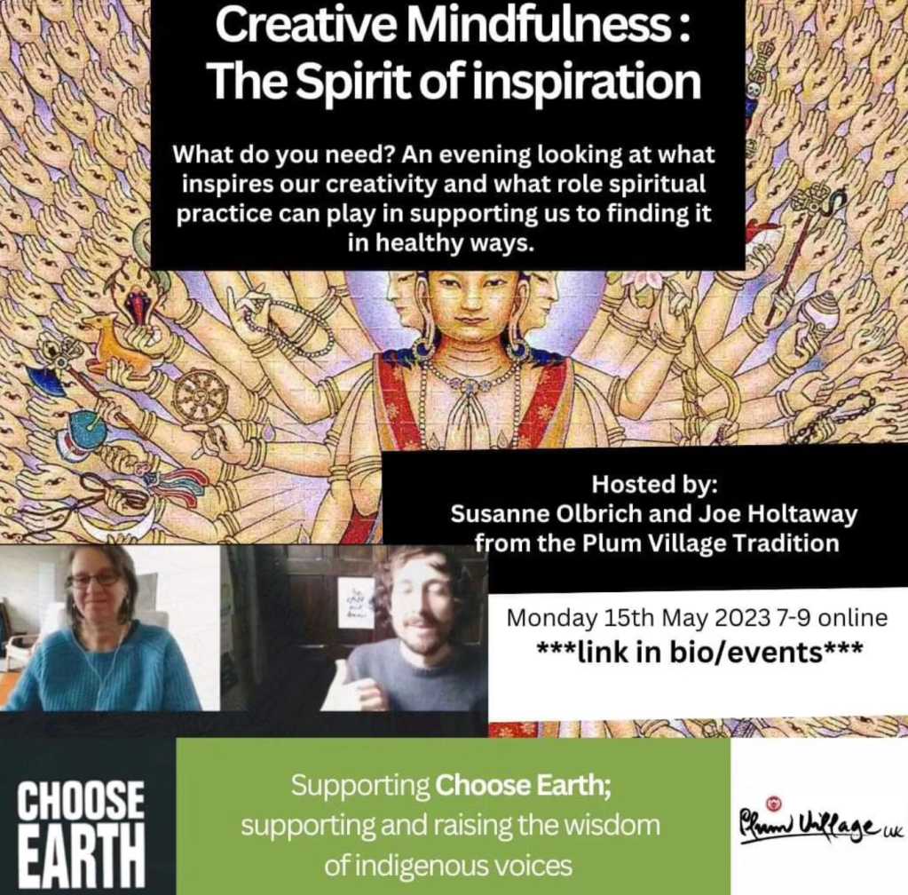 2 more events that had me online this month were Creative Mindfulness and Being Peace Fundraiser, both in the Plum Village UK community of Thich Nhat Hanh. Thanks those who have been online with myself and teacher in the community, Susanne Olbrich, exploring what it mean to be creative through the lens of mindfulness. The last 2 sessions looked at the Lost Words, a folk music project with UK folk artists, bringing musical life to a poetry book by Robert Mcfarlane about nature’s lost words and in the second session, how we can use our creativity to create a mythical being – our support spirit to enliven us and our arts and otherwise in life. You can find more about the events here, continuing in September after our Summer pause.