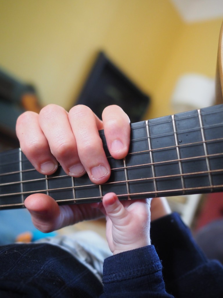 During this time, another thread was weaving itself quietly in: music. Just before Fye arrived, we’d been lucky to find an old piano delivered a week ago. On this and my guitar I began writing songs with Fye beside me — sometimes asleep in the sling, sometimes staring intently at the guitar!