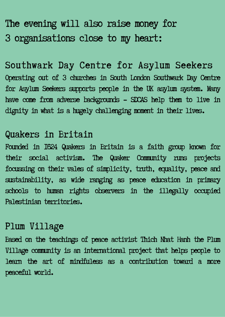 It’s stormy tonight; those who’ve travelled into the Quaker House, I’m hugely grateful for. The feeling is communal. Support for the shows came from Francois (their first gig), Eli Carvajal, Manu and Theo, Nayar Collective and Monica Max West.